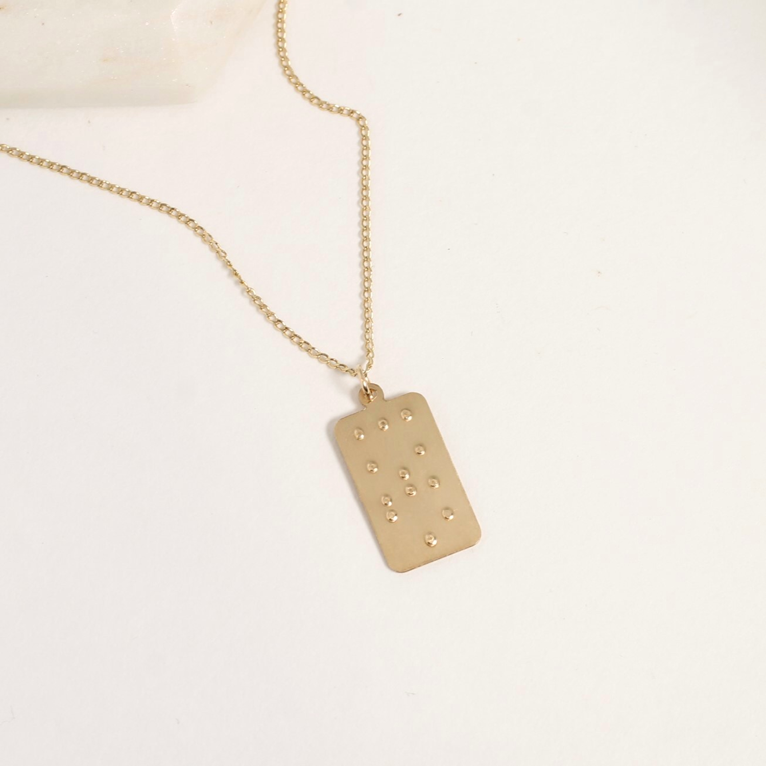 This necklace is a beautiful symbol of love not only in style but also in meaning! Featuring a custom hammered tag that says “love” in braille and strung on a delicate gold curb chain, this is a necklace literally makes sure you feel love when you wear it.